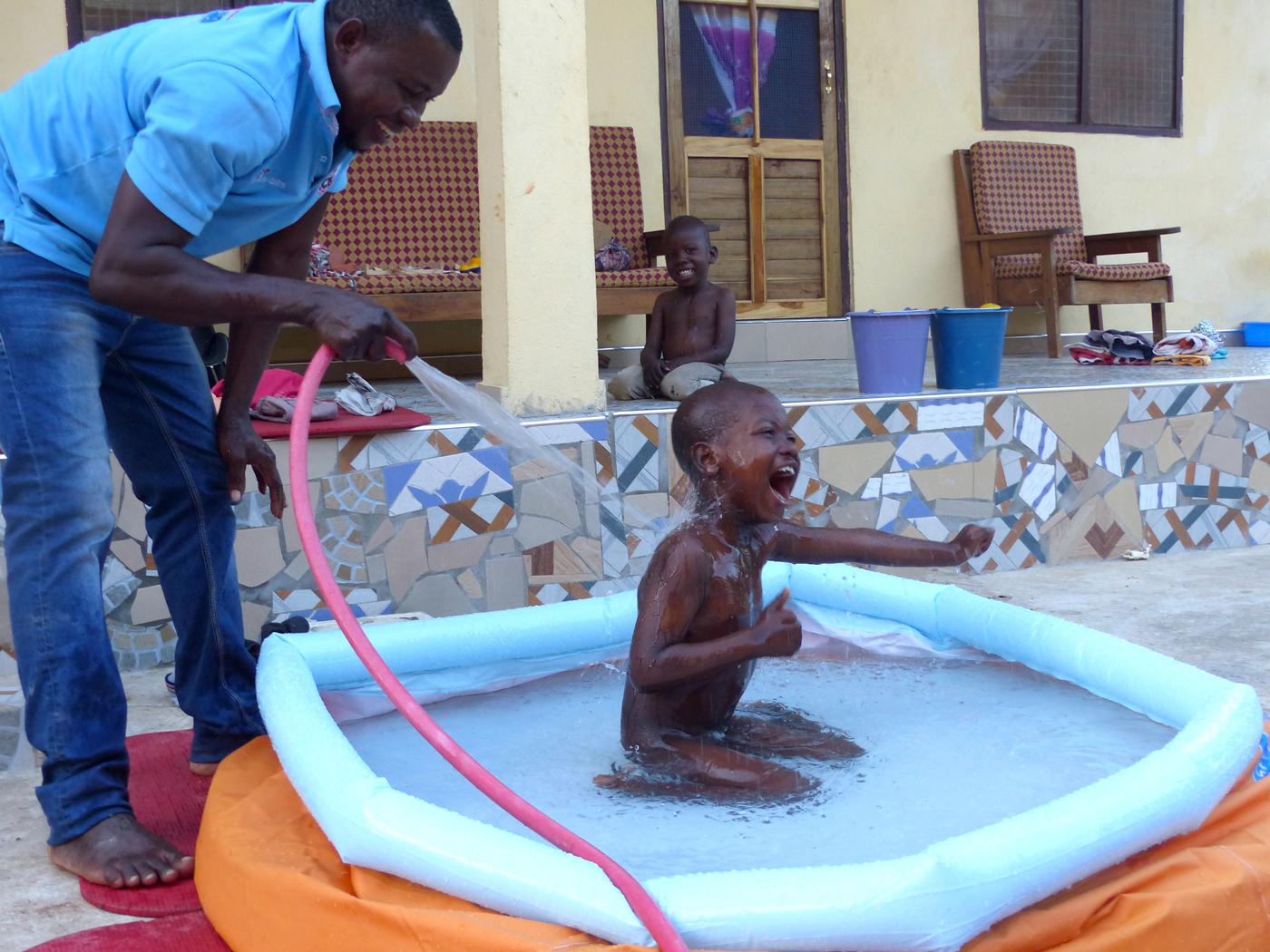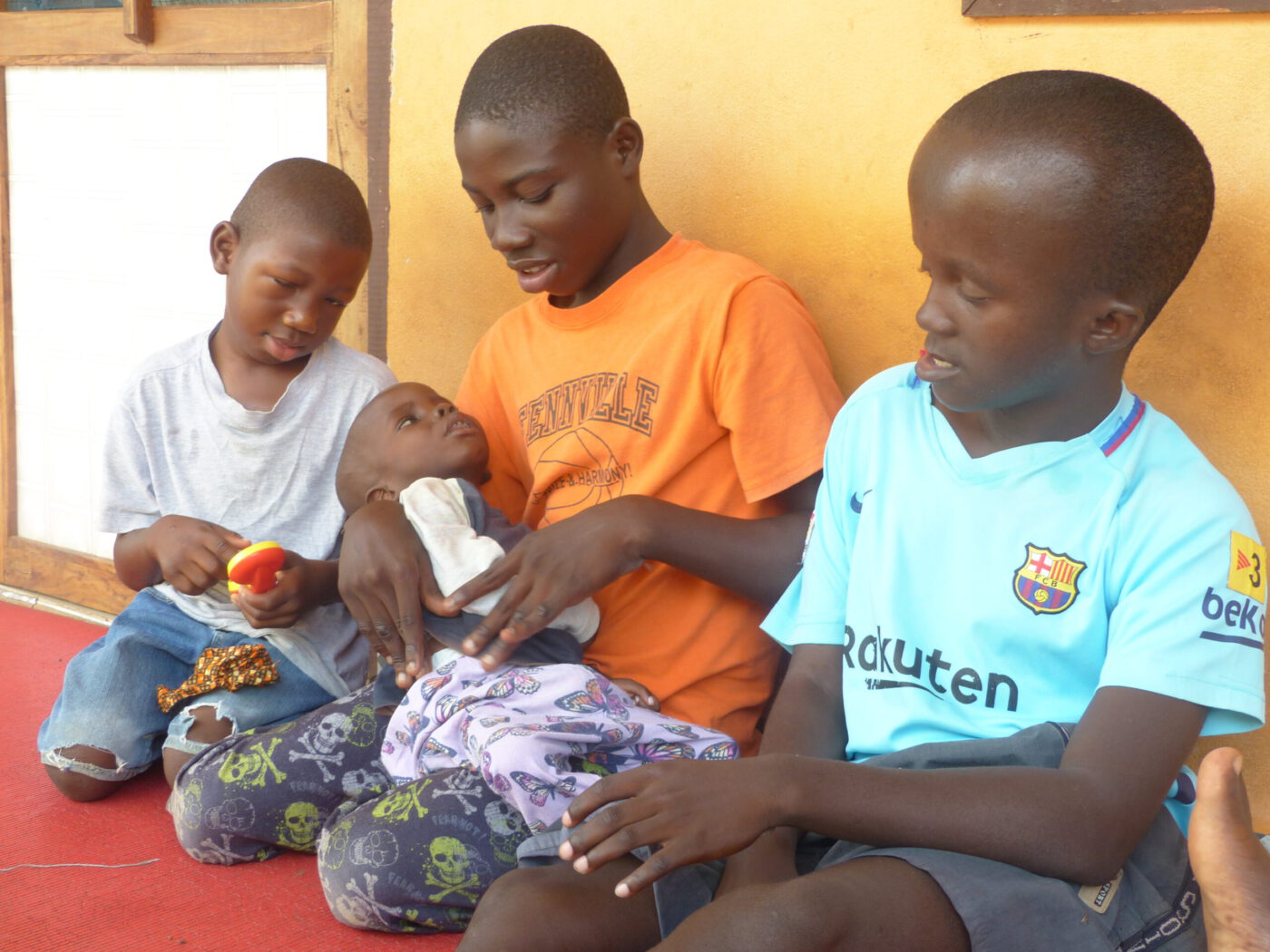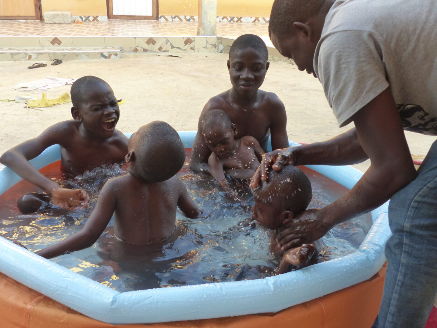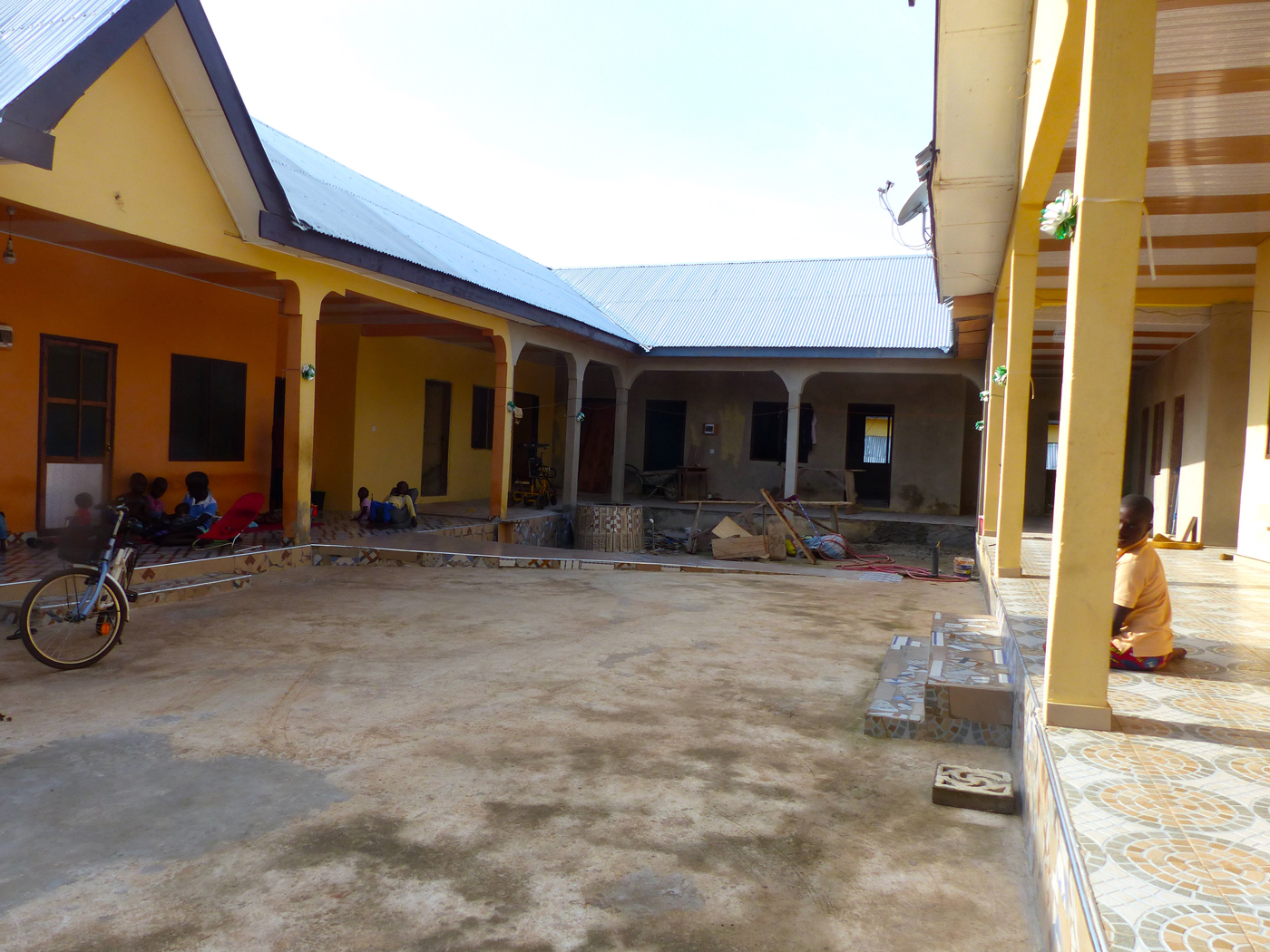 Der Hof zwischen den drei Häusern war noch im vergangenen Jahr eine einzige Schotterfläche, über die unseren Großen nur mit Hilfe von Knieschonern mühsam von einem Haus zum andern krabbeln konnten. Mittlerweile ist dieser Innenhof fein und glatt „zementiert“. Klaus Wenzel und seine Familie, die bereits in Kumasi (Ghana) eine Einrichtung mit erwachsenen Menschen mit Behinderung betreuen, haben im März unser Center besucht, die mühsam krabbelnden Kinder gesehen, gleich gehandelt und die zementierte Hoffläche gespendet.