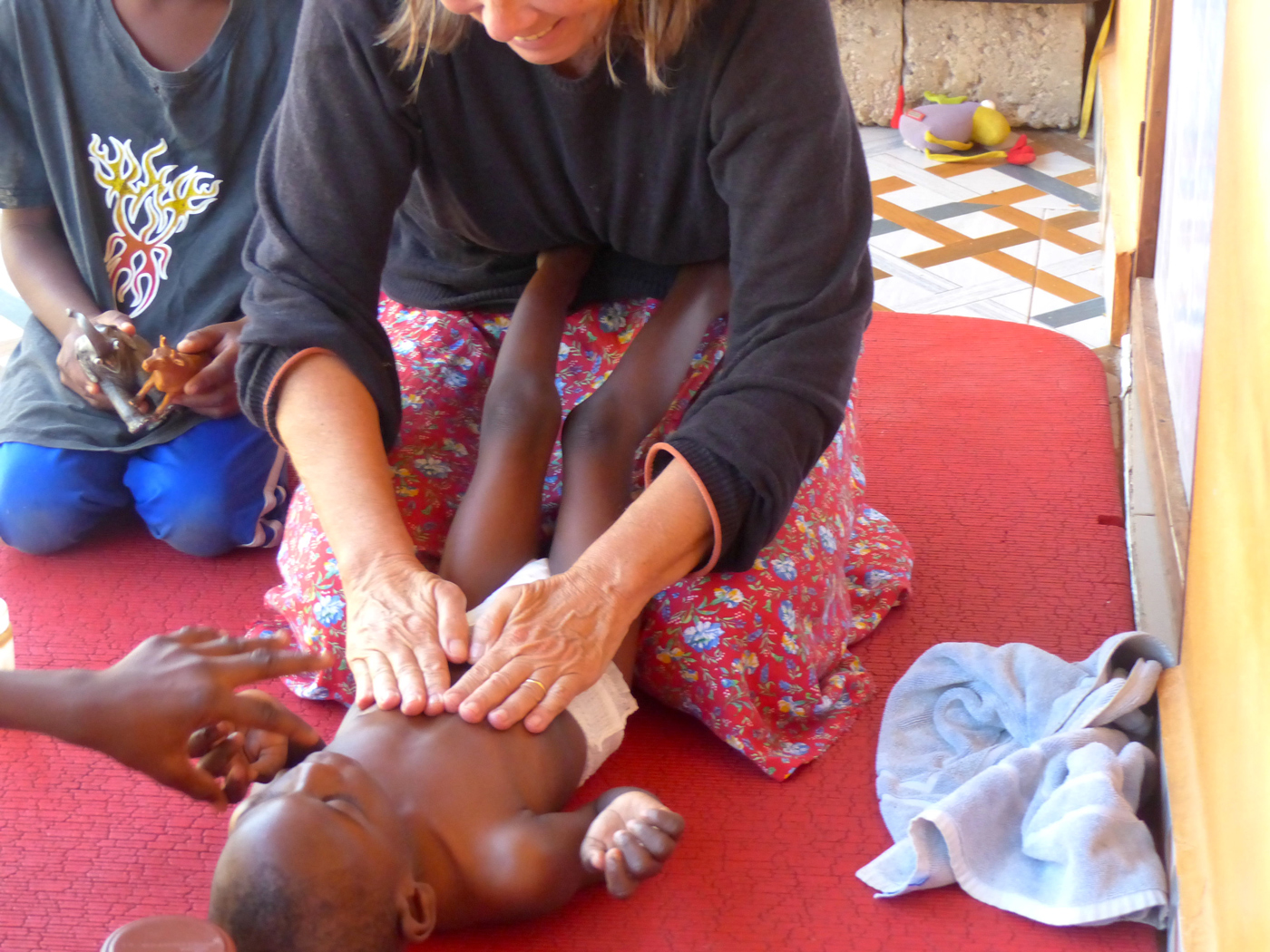 Der neue Raum ist groß genug, dass gleichzeitig für die Kleinen ein „kinder-garden“ eingerichtet werden konnte. Die Zwei- bis Fünfjährigen liegen auf einer Matte und spielen.