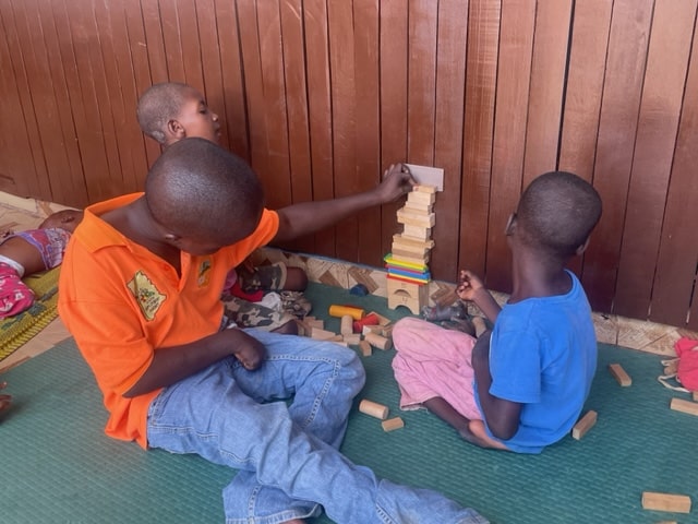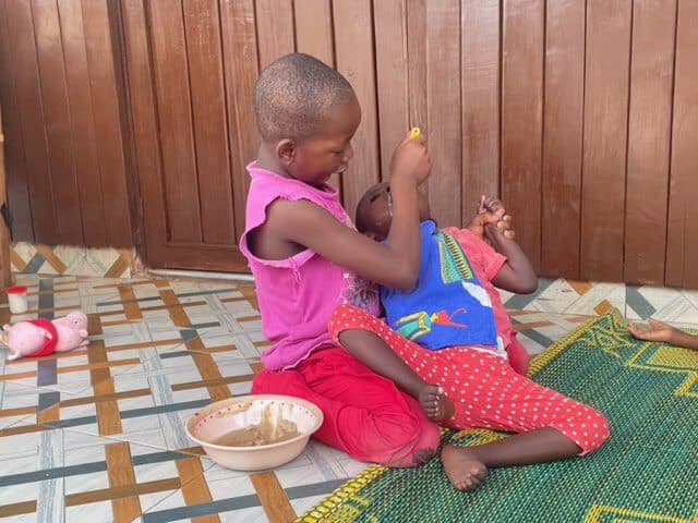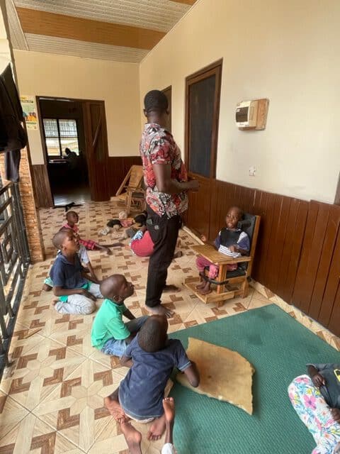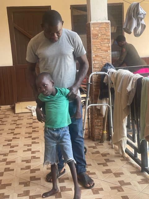 Bei den vielen Kindern, die mittlerweile bei uns leben und von denen die meisten dringend Physiotherapie benötigen, schafft unser Therapeut nur kleine Übungseinheiten pro Kind. Das ist zu wenig. Er ist auf der Suche nach einem Assistenten – bisher erfolglos. So entstand die Idee, dass unsere Mma Ekua, deren Onkel Physiotherapeut ist, sowie unser guter Lehrer und Hausvater Nana Ayala jeden Morgen die vom Physiotherapeuten angeleiteten Übungen durchführen.