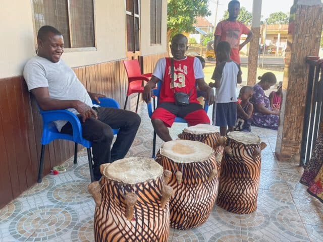 Und hier kommt wieder der „afrikanische Zufall“ ins Spiel: Nana Owusu und ich sitzen im Auto, wir befinden uns auf der Rückfahrt von einem Erntedankfest. In einer Kurve tritt Nana heftig auf die Bremse, er zeigt auf ein Haus und erklärt mir, dass dort ein Trommler wohnt, der auch selber Trommeln baut. Erst beim Vorbeifahren ist es ihm wieder eingefallen…