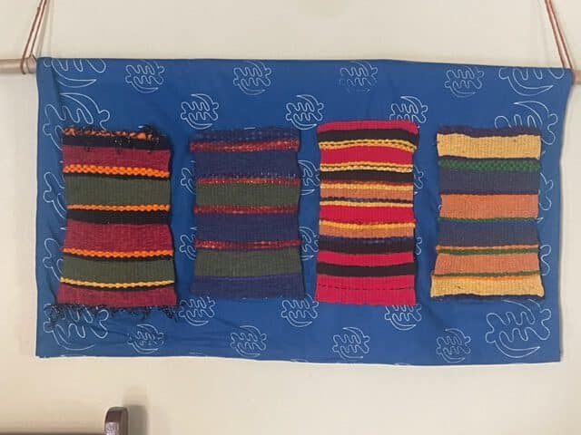 Schon vor Jahren habe ich einige Schulwebrahmen ins Center gebracht, auf denen vor allem Bright mittlerweile wunderschöne Deckchen aus reiner Wolle webt. Manche von ihnen habe ich auch in diesem Jahr zu einem Wandteppich verarbeitet, er hängt jetzt im Klassenraum.
