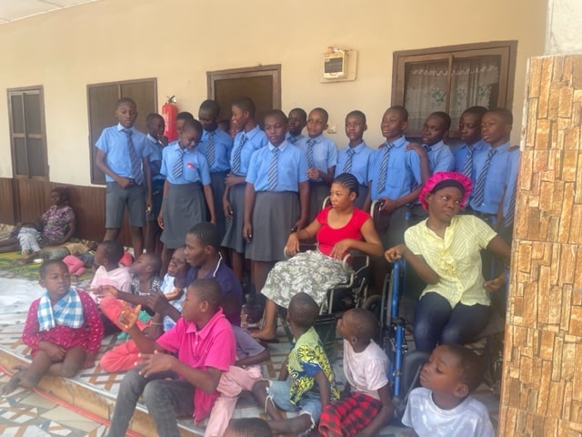 An einem dieser frühen Abende sah ich auf unserem Innenhof ca. 12 unserer Kinder ruhig und andächtig in einem Halbkreis sitzen, ein paar Treppenstufen höher, auf unserer Terrasse, saßen Sam (21Jahre) und Kwadwo (10Jahre). Weder Sam noch Kwadwo können sprechen. Aber Sam sprach zu der unter ihm sitzenden Schar mit ernster Miene, ein paar gutturalen Lauten und mit zahlreichen Gesten. Die gesamte Stimmung war ernst, irgendwie feierlich. Später erfuhr ich von Nana Ayala , dass es zwischen zwei Kindern einen heftigen Streit gegeben hatte und Sam versuche nun zu vermitteln und zu schlichten. Nachdem Sam gesprochen hatte, breitete Kwadwo weit seine Arme aus, er hatte etwas Priesterliches an sich. Auch er sprach und die Kinderschar stimmte ein Lied an, etwas rau, immer wieder war ein „Halleluja“ heraus zu hören.
