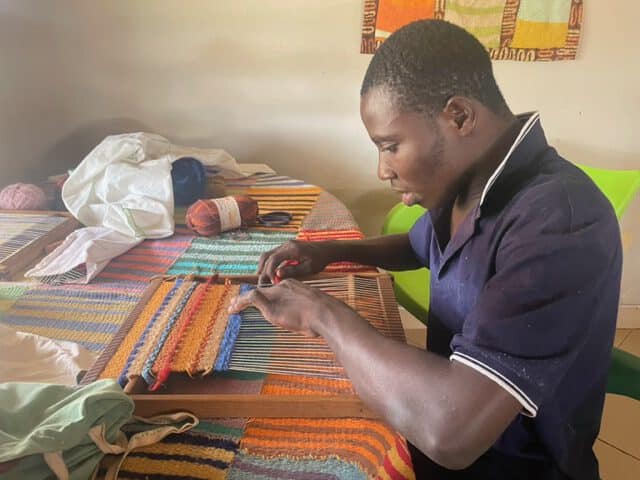 Dann gibt es noch die kleinen quadratischen Topflappen-Webrahmen, auf denen kleine Flickenteppiche gewebt werden, die zusammengenäht Fußmatten ergeben. Dann habe ich aus der „Filzblüte“ in Aachen die Inspiration und praktische Hilfe erhalten, größere Sizkissen-Webrahmen einzuführen. Sam schafft es unter größter Anstrengung und Konzentration wunderbare Sitzkissen zu weben.